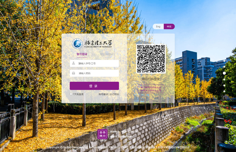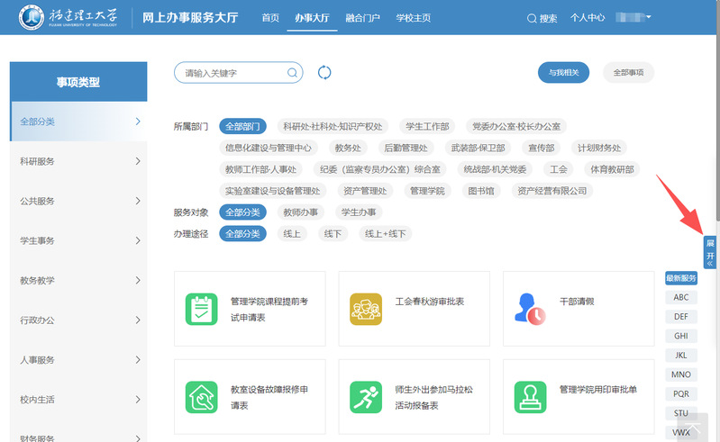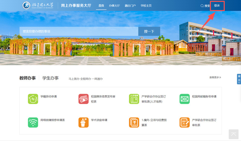 1、打开浏览器,访问网上办事服务大厅(https://hall.fjut.edu.cn),点击右上角“登录”;或访问福建理工大学融合门户(https://my.fjut.edu.cn)。