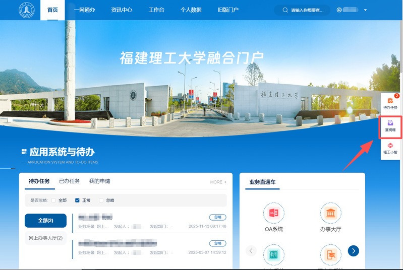 4.或点击融合门户页面右侧悬浮图标中的“草稿箱”,也可找到之前保存下的草稿。